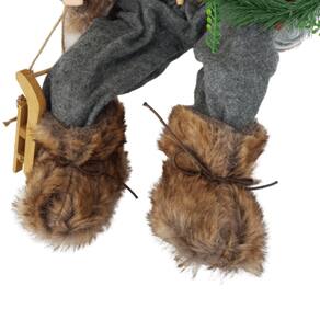 PAPAI NOEL SENTADO COM 70cm DE ALTURA SEGURANDO TRENÓ DE MADEIRA E GUIRLANDA VERDE, ESTRUTURA EM PLÁSTICO, POLIETILENO E ARAME COM GORRO E CASACO DE TRICÔ VERMELHO, CALÇA DE FELTRO CINZA, COLETE DE TRICÔ COLORIDO COM BARRAS EM PELE CARAMELO E BOTÕES DO CASACO EM MADEIRA.