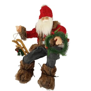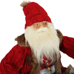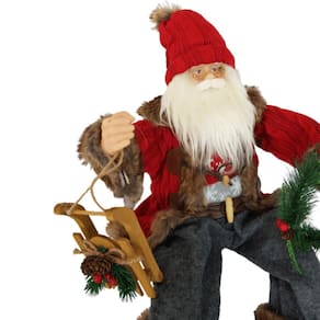 Papai Noel sentado Vermelho com estrutura em polietileno e Polipropileno, 70cm de altura, segurando trenó de madeira e guirlanda verde. O Gorro e o Casaco de tricô vermelho, a calça de feltro cinza, o colete de tricô colorido, as barras em pele caramelo e os botões do casaco de madeira são um charme a parte que deixa ele ainda mais fofo e simpático. Confeccionada com materiais PREMIUM e acabamento finíssimo, lindo, perfeito!