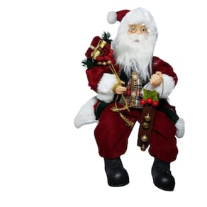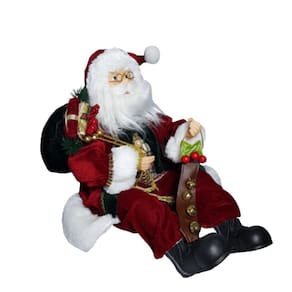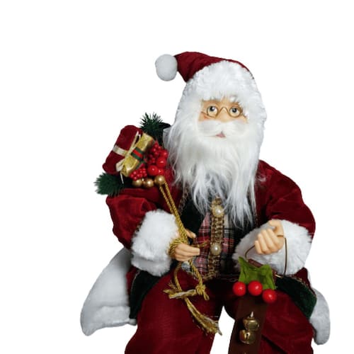 Papai Noel 45cm Estrutura em Polietileno e polipropileno com óculos, roupas em veludo bordo segurando saco de presentes.