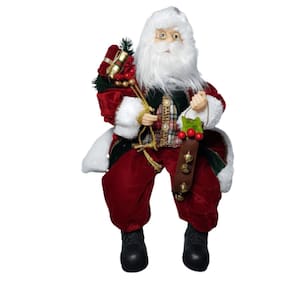 Papai Noel sentado bordo com estrutura em polietileno e Polipropileno, 45cm de altura, segurando saco de presente em veludo verde. O Gorro, a calça e o Casaco de veludo bordo com barras de pele branca, o colete de poliéster colorido e os detalhes com cordão dourado são um charme a parte que deixa ele ainda mais fofo e simpático. Confeccionada com materiais PREMIUM e acabamento finíssimo, lindo, perfeito!