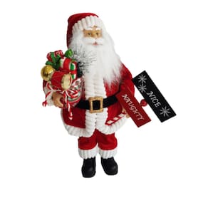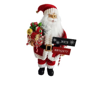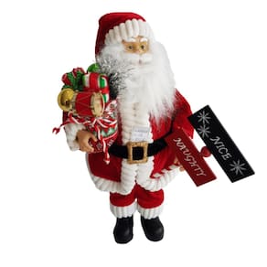 Papai Noel com 50cm de altura, estrutura em polipropileno, segurando placa em MDF e saco de tricô vermelho e verde com presentes. Gorro, casaco e Calça em veludo vermelho com barras trabalhadas na cor branca. Cinto de veludo preto com fivela dourada. Botas pretas.