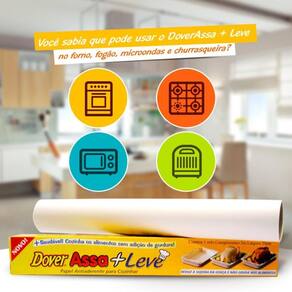 e se isto ainda vier junto com a eliminação da limpeza pesada de formas, frigiderias e panelas isto é o que proporciona o dover assa + leve, o novo papel antiaderente, utilizado na preparação de alimentos no forno, fogão, microondas e churrasqueira. É + leve e + saudável, pois cozinha os alimentos sem adição de gordura; - facilita a limpeza de formas, frigideiras e refratários; - os alimentos não se agarram no fundo; - assa os alimentos por igual; - é rápido e seguro, pois reduz o tempo de preparo dos alimentos; - vai ao forno convencional, microondas, frigideira e até churrasqueira; - inovador, econômico, ecológico e adapta-se a vários tipos de alimentos e formas de cozinhar; - não é papel manteiga não gruda nos alimentos - qualidade dover-roll