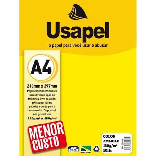 Papel Color A4 180g Amarelo 50 folhas Usapel para você soltar a sua imaginação.Ideal para scrapbooking, lettering, trabalhos escolares, desenho, pintura, recorte e colagem.Obs.: Imagens meramente ilustrativas. As cores do produto podem variar de acordo com o lote. ESPECIFICAÇÕESMarca: UsapelTipo: Color (Offset)Gramatura: 180g/m2Formato: A4 (21 x 29,7 cm)Cor: AmareloQuantidade: 50 folhas