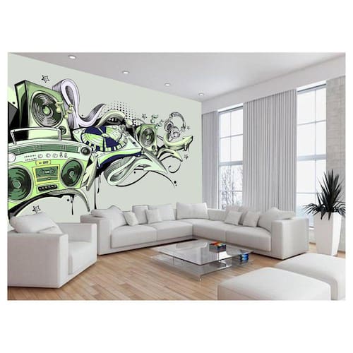 A impressão é feita em vinil adesivo. É um material lavável, impermeável, autocolante e antimofo. O produto cobre uma área de 3,50m, contando com 1,75 metro de altura por 2 metros de largura.