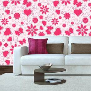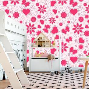 Papel de parede adesivo rosa com corações e flores vermelhos