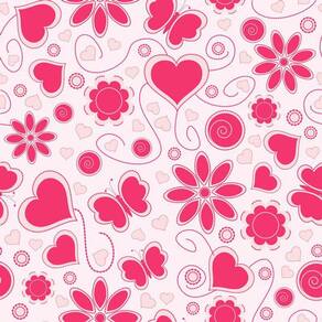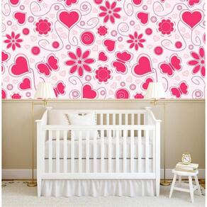 Papel de parede adesivo rosa com corações e flores vermelhos