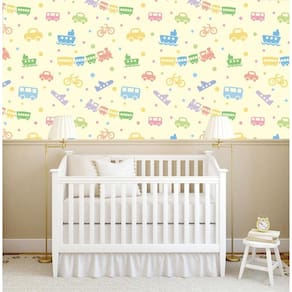 Papel de parede amarelo com brinquedos infantil bebe adesivo