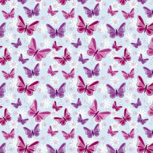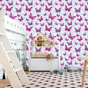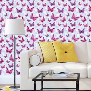 Papel De Parede Azul Claro Com Borboletas Vermelhas E Lilas