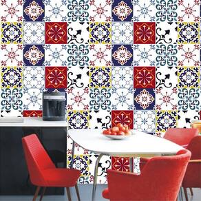 Papel de parede azulejo vermelho e azul cozinha lavatório