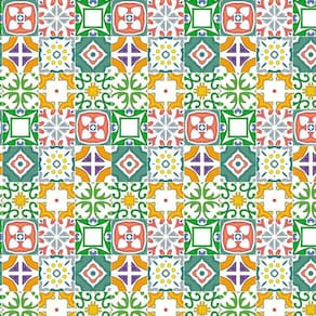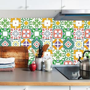 Papel de parede azulejo vermelho verde laranja cozinha pia