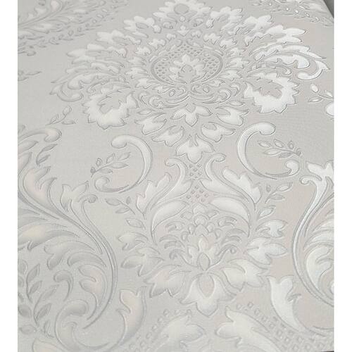 Papel de parede importado, coleção Tesori italiani, proteção em vinilico limpável, estilo arabesco cor cinza claro e traços bege 45015