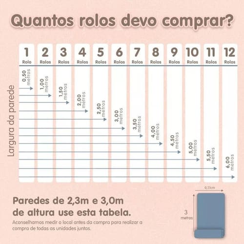 Tamanho Medida cada Rolo: 0,50 Largura metros x 3,00 Altura metros