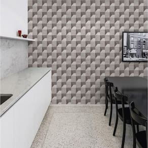 O geométrico aqui ganha uma combinação de cores claras e escuras, que fazem com que a parede ganhe profundidade e um efeito tridimensional.