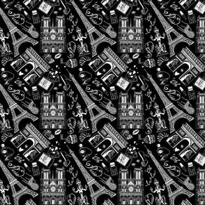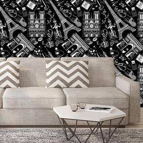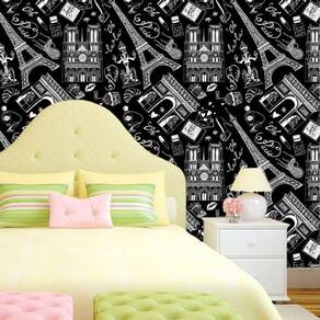 Papel de parede preto e desenhos paris branco autocolante