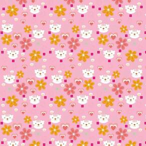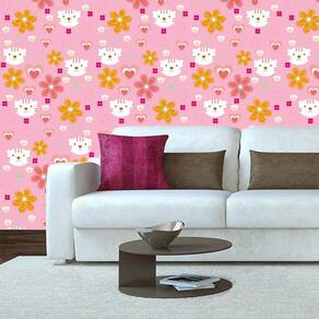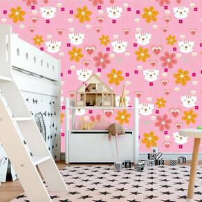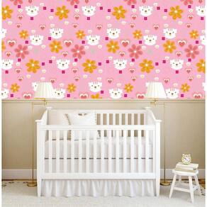 Papel De Parede Rosa Flores Gatinha E Corações Decorativo