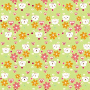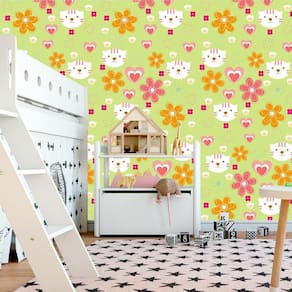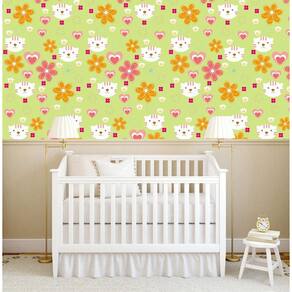 Papel De Parede Verde Flores Gatinha E Corações Decorativo