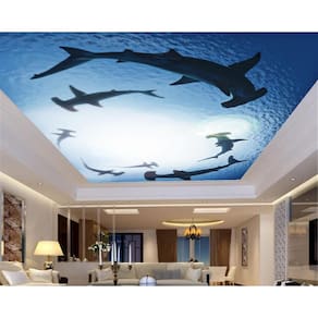 Papel De Teto Fundo Do Mar Cardume Tubarões 3,5M Rof89
