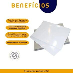 Principais características: - Tamanho: A4 210mm x 297mm - Cor: Branco - Acabamento: Glossy/Brilhante - Gramatura: 180g - Quantidade no Pacote: 50 folhas - À prova d'água - Secagem rápida