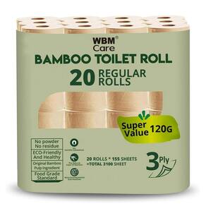 Papel higiênico de bambu de 3 camadas WBM Care, 155 folhas por rolo - 20 rolos, macio e forte, polpa de bambu 100% natural, lenço de banho premium, seguro para sépticos, lavável