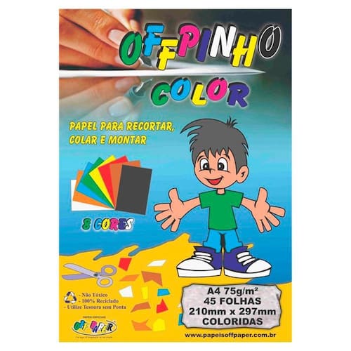 Contém:- Pacote com 45 folhas;- Formato A4 210x297mm ;- Gramatura 75g/m;- Recortar, colar e montar.- Matéria prima sustentável e renovável;Use sua imaginação e crie muitas coisas legais com o offpinhoGaranta já a suaPAPEL A4 45 FOLHAS. 8 cores diferentes - Não tóxico.- 100% reciclado.- Utilize tesoura sem ponta.