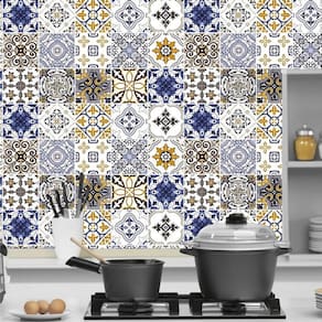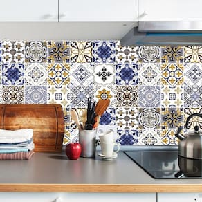 Papel parede azulejo tons branco e azul autocolante cozinha