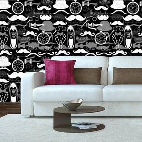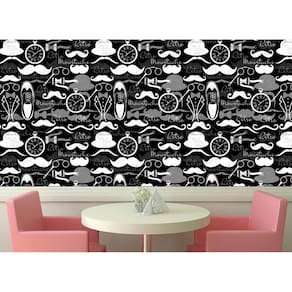 Papel parede preto e desenhos brancos sapatos relógio chapéu