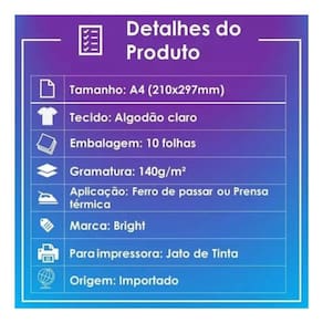 Produto: Papel Transfer para Tecidos Claros Marca: Bright Linha Alpha Tamanho: A4 Gramatura: 140g Quantidade: 10 Folhas Compatibilidade: Tecidos de cores claras algodão, poliéster, mistos .