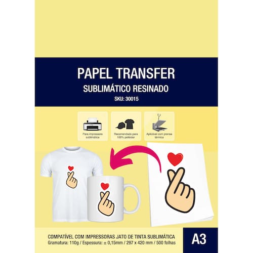 O Papel Sublimático Resinado Fundo Azul oferece secagem rápida e é considerado um dos melhores para sublimação em tecidos sintéticos. Seu revestimento de acetato especial não deixa que a tinta penetre no papel, garantindo cores vibrantes na hora da transferência. Compatibilidade: Produtos: tecidos 100% poliéster, porcelanas, madeiras, metais, plásticos e entre outras superfícies resinadas (acetato).Impressoras: jato de tinta sublimática Características: Quantidade: 1 pacote com 500 folhasGramatura: 110gTamanho: A3 30x40cmTecnologia: Transfer para Impressoras com tinta sublimáticaAcabamento: Resinado (acetato)Material: PapelIndicado: tecidos 100% poliéster, porcelanas, madeiras, metais, plásticos e entre outras superfícies resinadas.Garantia: Contra defeito de fabricaçãoOrigem: Nacional Modo de Usar: 1º – Imprimir a arte desejada no lado frontal do papel em sua impressora para sublimação;2º – Colocar o papel com a parte frontal virada para o produto que deseja estampar;3º – Prensar o produto de acordo com o tempo e temperatura indicada pelo fabricante do mesmo;4º – Para sua segurança aguarde o produto esfriar e remova o papel resinado do produto;