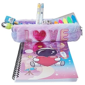 Fixos: 1 Pasta Necessaire fechamento a zíper no tamanho 33 x 23 cm; 1 Caderno Metalizado (pequeno e espiral); 1 Estojo Fofo; 1 Caneta com 6 cores; 1 Marca Texto.
