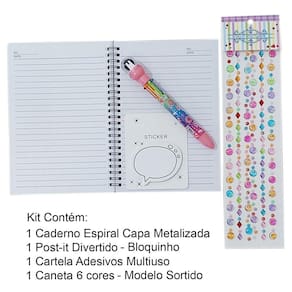 Contém: 1 Caderno Capa Metalizada + 1 Cartela de Adesivos Cristal + 1 Bloquinho Post-its + 1 caneta com seis cores.