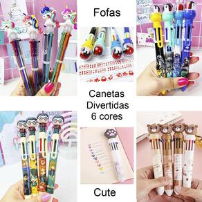 Caneta esferográfica, ela possui 6 cores de tinta com um simples click. Carimbo integrado para você personalizar. Design ergonômico para uma escrita suave e precisa. Tinta de alta qualidade que não borra. Perfeita para estudantes, profissionais, artistas e entusiastas. Feita para durar e com um acabamento elegante. Tinta esferográfica, cores das tintas: preto, vermelho, laranja, verde, azul e roxa. Não é possível a escolha do desenho da caneta.