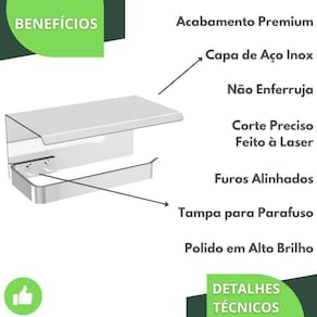 Banheiros modernos e sofisticados exigem produtos de qualidade. Prezando pela elegância e charme do seu banheiro, desenvolvemos a Papeleira Porta Papel Higiênico Apoio Celular Plus, onde cada ponto do produto foi cuidadosamente elaborado para deixar seu banheiro com um visual clean e sofisticado, além de proteger seu celular contra quedas.