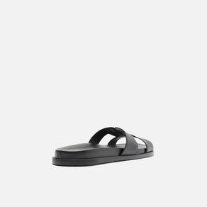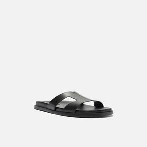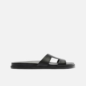 Papete feminina preta com design minimalista e elegante.. Confeccionada em material de couro, possui tira larga com recortes geométricos que garantem estilo e respirabilidade.. O solado é reto, levemente elevado, proporcionando conforto e estabilidade no uso diário.. Versátil e moderna, combina com looks casuais, urbanos e até produções mais arrumadas para dias quentes..