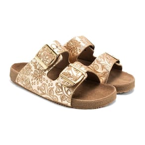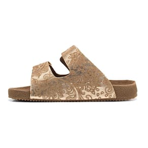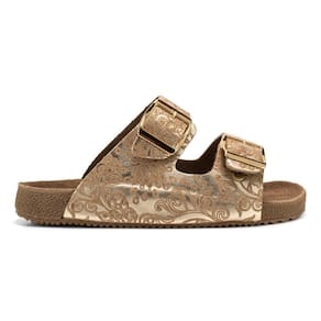 Aposte no estilo e na versatilidade da sandália papete. Confeccionada em couro, com acabamento metalizado, o modelo conta com solado em borracha antiderrapante e fechamento por fivelas que oferece segurança e conforto ao caminhar, detalhes que garante a peça um visual moderno e autêntico.