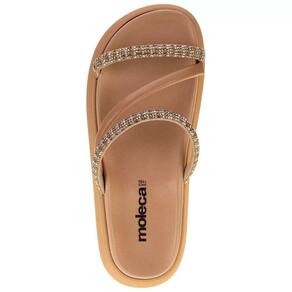 A Papete Moleca Três Tiras Strass Feminina Nude é confeccionada em material sintético de palmilha macia e solado resistente. Seu fechamento é calce fácil com três tiras que auxiliam no firmamento dos pés ao caminhar; uma no dorso com enfeite em strass, outra na diagonal em material napa e uma sobre os dedos do pé com enfeite em strass. Seu solado é antiderrapante e de EVA bastante sólido.