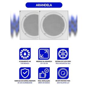 Especificações técnicas arandela: - recorte redondo para alto-falantes de 6,5 polegadas que facilita o alinhamento; - fabricada em material resistente de alta durabilidade; - fácil instalação direta em gessos; - medidas da arandela: 22 x 22 cm; - acabamento na cor branca.