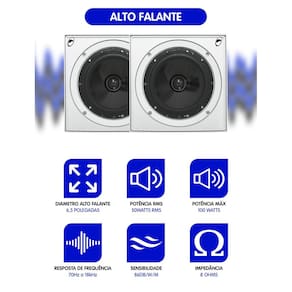 Itens inclusos: - 2 alto-falante kaz de 6,5 polegadas; - 2 arandela quadrada com recorte redondo; - 2 tela de proteção; - suportes para instalação.