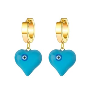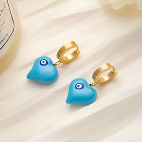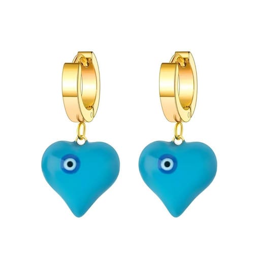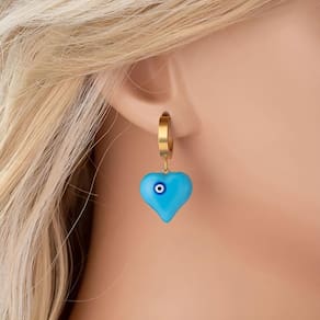 Beleza e proteção se unem nesse brinco azul lindo em formato de coração com olho grego.