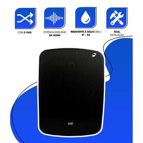 CARACTERÍSTICAS: - Caixa acústica 2 vias - woofer 6.5 de alto desempenho, tweeter imã de neodímio, bobina de 1 e diagrama de PEI - Resistente à água grau IP-44 - Conectores revestidos a ouro - Desenho Exclusivo para Alta Potência e Resposta em Baixas Frequências - Gabinete injetado em PP de alta resistência - Telas em alumíno Anti-Manchas - Suporte para Parede Removível Universal - Uso em Ambientes Internos e Externos