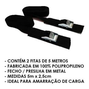 Par Cinta Fivela Catraca Carga Rack Teto Amarração 5 Metros Preto 5 Metros Cinta com presilha e proteção para amarração de cargas com 5 metros comprimento cada e 25mm de largura - jogo com 2 peças A cinta com proteção para amarração de carga com medida de 5 metros de comprimento e 25mm de largura têm uma ótima resistência pois são confeccionadas em polipropileno e possui uma presilha feita de zamak super resistente a corrosões comparado com latão ou ferro, além de uma proteção extra para evitar riscos com eventual contato da presilha na pintura do veículo. Esta cinta é ideal para quem precisa prender algo com facilidade, o conjunto possui uma resistência suficiente para prender diversos tipos de produtos com segurança como pranchas de surf, bikes, caiaques, cargas, bagagens etc.. Características do produto: Marca: smd Quantidade s :2 peças Especificações técnicas: Composição: 100% polipropileno 25mm Presilha: metal zamak de 25mm Capacidade de carga: 70kg para amarração Medidas: 5m x 2,5 cm cada fita. Peso: 0.30 kg : 3 meses Nosso horário de atendimento é de segunda a sexta das 9 as 17 horas exceto feriados . Boa compra... Atenção: as compras realizadas em nome de pessoa jurídica estão sujeitas à cobrança de icms, conforme protocolo icms 41, de 4 de abril de 2008. Caso você tenha dúvidas sobre o percentual a ser aplicado, consulte a cláusula segunda, 1 do referido protocolo. Marca: Não Informado Ean: 9000000207035