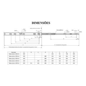 Fabricadas em aço com espessura de 0,7mm, as corrediças têm um acabamento em zinco eletrolítico, que agrega durabilidade e resistência à corrosão. Com um design que permite a abertura total do comprimento nominal, oferece um deslizamento suave e silencioso, proporcionando uma experiência de uso agradável e eficiente.