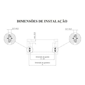 As corrediças contam com um sistema de extração total e uma trava lateral, que facilita a retirada da gaveta quando necessário. A fixação lateral apresenta furos múltiplos de 32mm, garantindo uma instalação simples e segura, adaptando-se a diferentes tipos de móveis e estruturas.