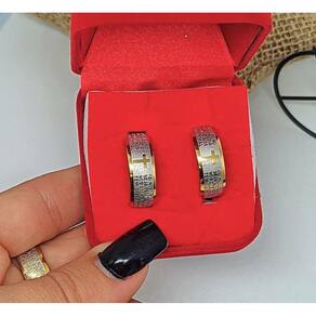 Par de Aliança Anél Oração Pai Nosso em Português Aço Inox 316L Dourado + Estojo Veludo Caixa Porta Jóias Presente