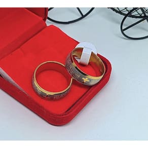 Par de Aliança Anél Oração Pai Nosso em Português Aço Inox 316L Dourado + Estojo Veludo Caixa Porta Jóias Presente