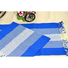 Jogo de tapetes fabricado em tear, na cor degradê azul, com franjas em duas laterais.