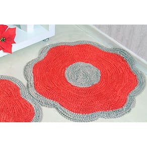 Jogo de tapetes com formato de flor fabricados em poliéster, nas cores vermelho e bege.