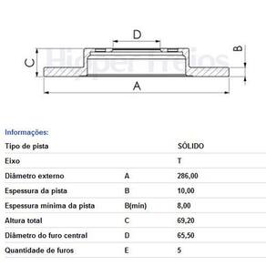 =Especificações= Freio dianteiro Eixo T Diâmetro Externo 286.00 mm Espessura da Pista 10.00 mm Espessura Mínima 8.00 mm Altura Total 69.20 mm Diâmetro Furo Total 65.50 mm Quantidade de Furos 5 Par Modelo sem Cubo