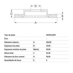 CARACTERÍSTICAS: Dianteiro Sem Cubo Diâmetro externo A 284,00 Espessura da pista B 22,00 Espessura mínima da pista TH(min) 20,00 Altura total C 43,50 Diâmetro do furo central D 59,00 Quantidade de furos E 4