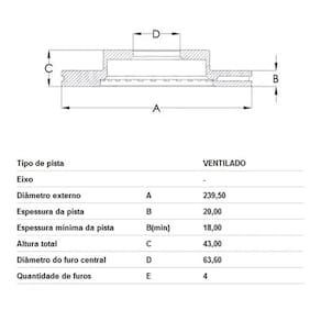 CARACTERÍSTICAS: Dianteiro Ventilado Sem Cubo Diâmetro externo A 239,50 Espessura da pista B 20,00 Espessura mínima da pista TH (min)18,00 Altuta Total C 43,00 Diâmetro do furo central D 63,60 Quantidade de furos E 4