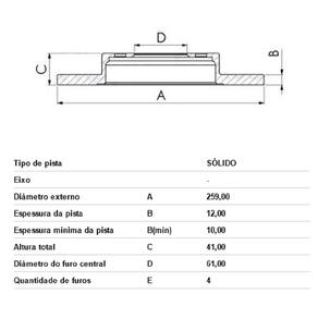 CARACTERÍSTICAS: Dianteiro Sólido Sem Cubo Diâmetro externo A 259,00 Espessura da pista B 12,00 Espessura mínima da pista TH(min) 10,00 Altura Total C 41,20 Diâmetro do furo central D 61,00 Quantidade de furos E 4
